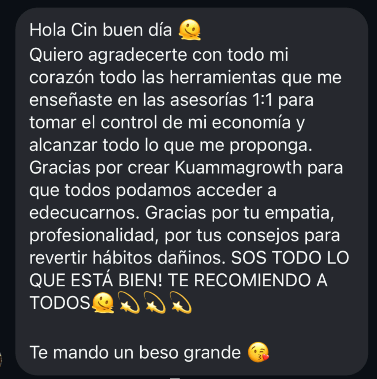 Hace 1 año fundé Kuamma Growth con el propósito de ayudar a mujeres a que exploten todo su potencial y vivan la vida que realmente desean. Si llegaste hasta acá, seguramente queres eso para tu vida, y yo te voy a ayudar.